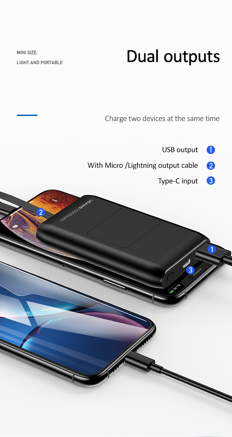 USAMS 2.1A Mini Power Bank with Phone Holder and Cable 5000mAh (Dual outputs)